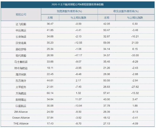 以下是主干航線(xiàn)班輪公司和它們班輪聯(lián)盟準(zhǔn)班率指數(shù)表: